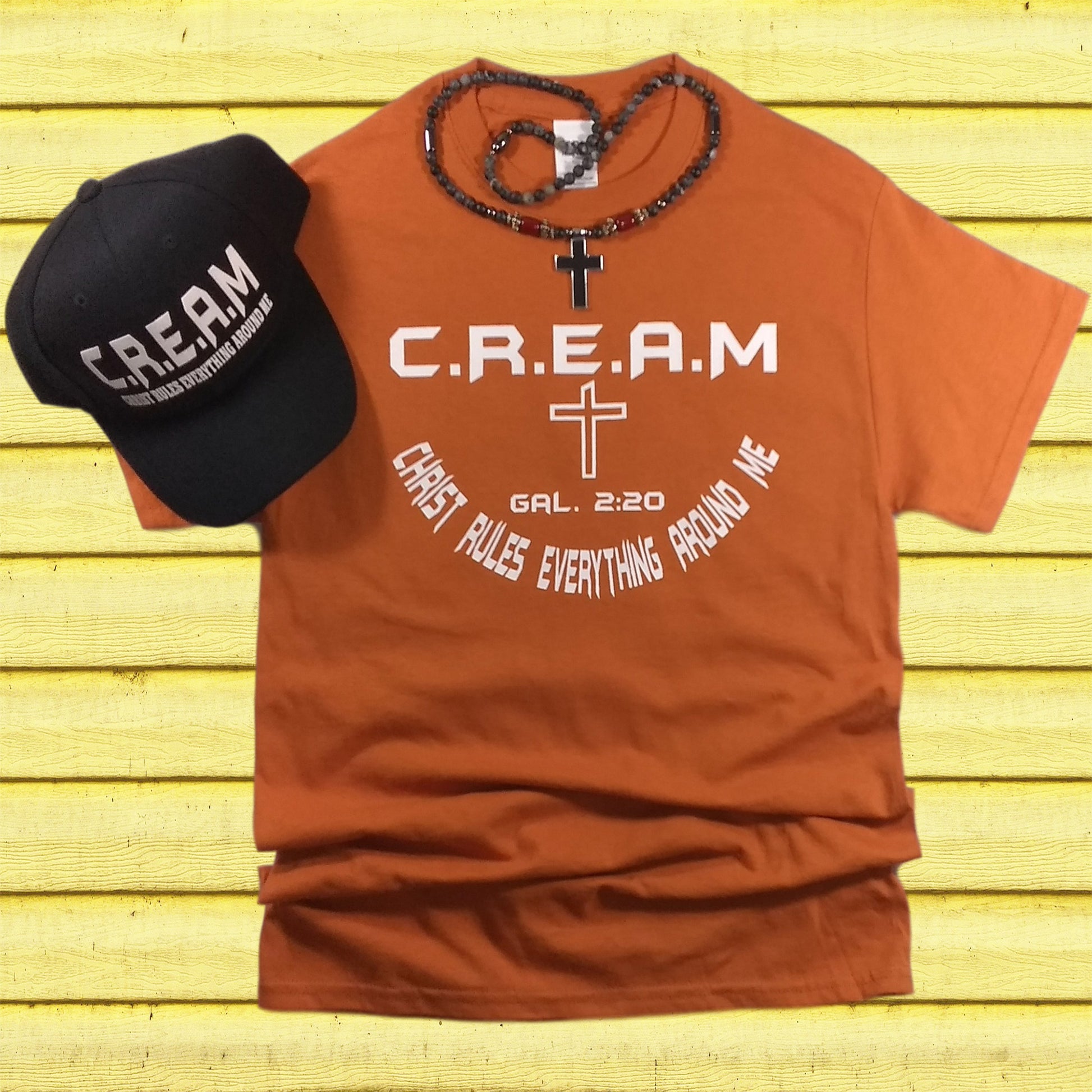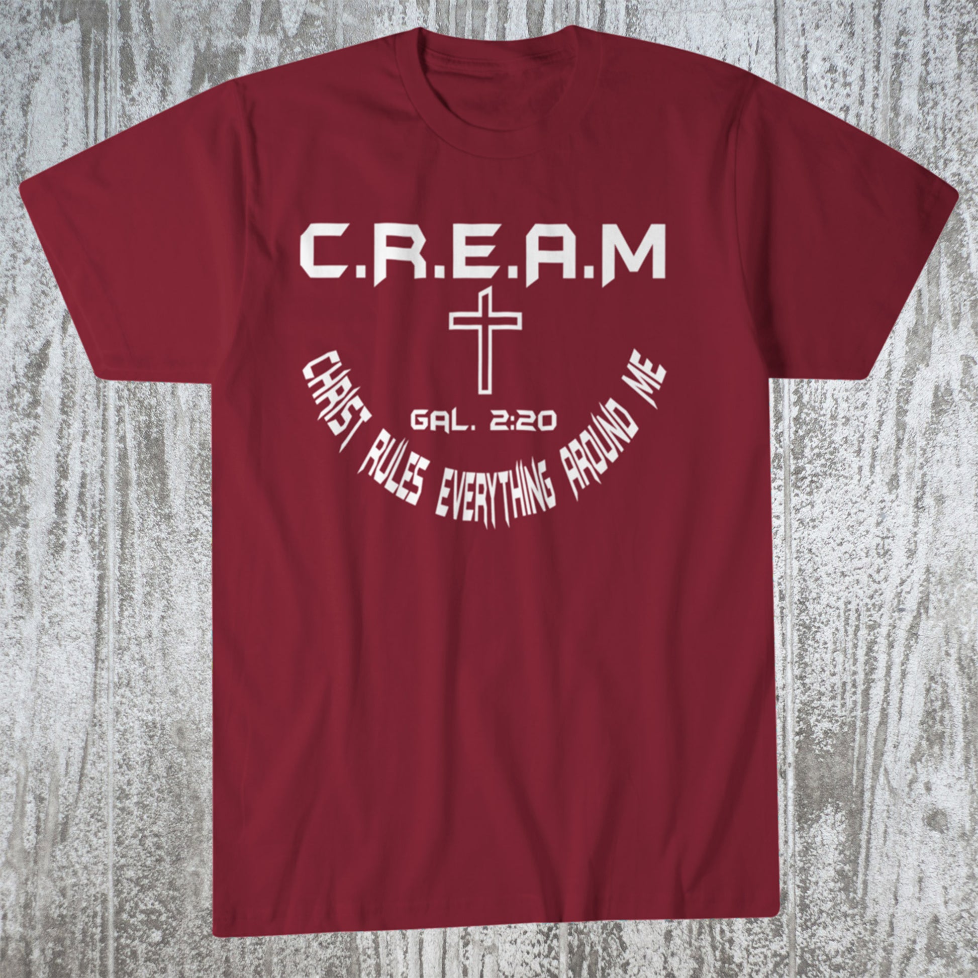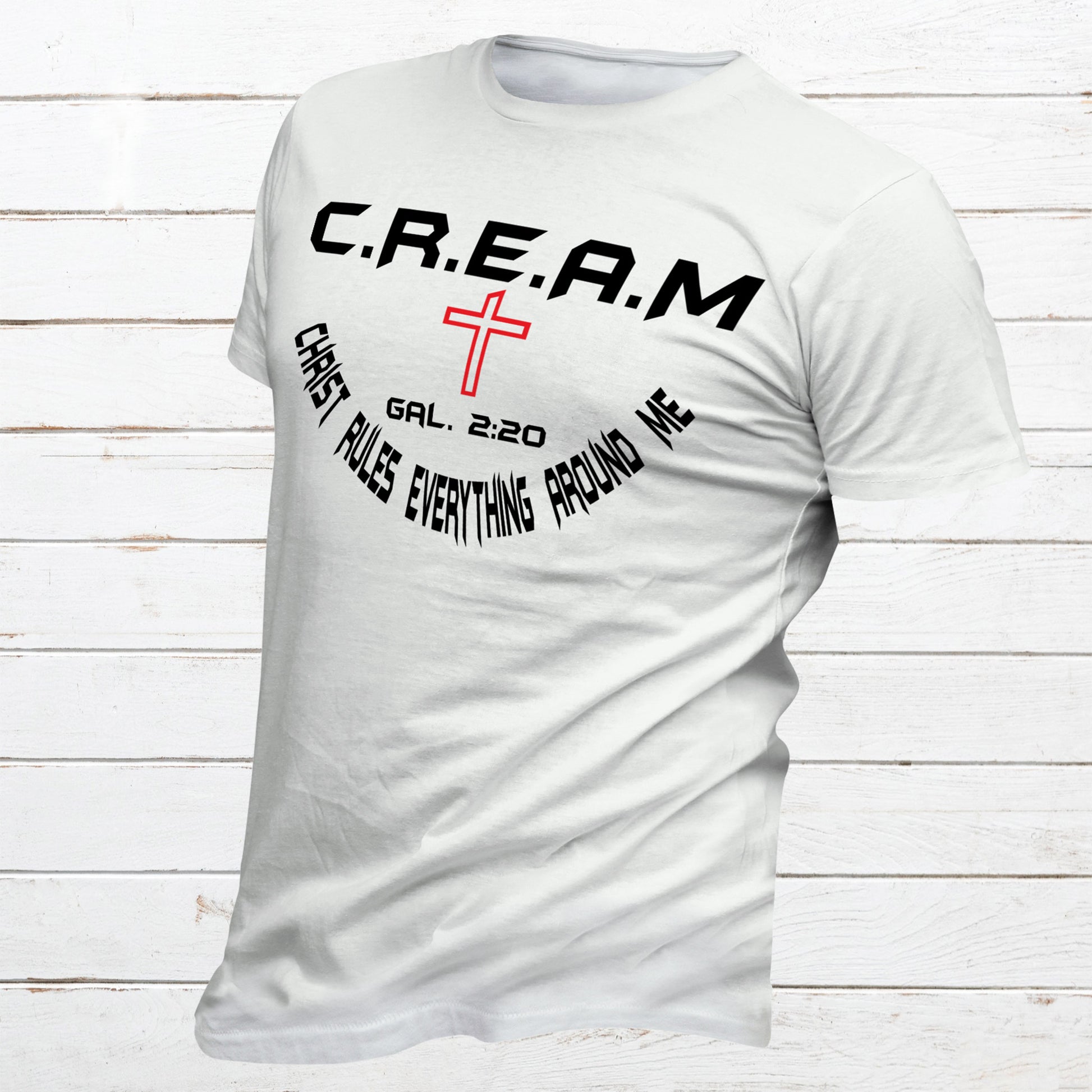 Christ Rules Everything Around Me (C.R.E.A.M) is a shirt design inspired by Galatians 2:20: "I am crucified with Christ: nevertheless I live; yet not I, but Christ liveth in me: and the life which I now live in the flesh I live by the faith of the Son of God, who loved me, and gave himself for me."